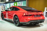 Audi RS e-tron GT volledig elektrische luxe sportsedan op de autoshow. De RS is de high-performance variant van de e-tron GT, Audi's volledig elektrische sedan, en is qua platform en technologie nauw verwant aan de Porsche Taycan.