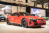 Audi RS e-tron GT volledig elektrische luxe sportsedan op de autoshow. De RS is de high-performance variant van de e-tron GT, Audi's volledig elektrische sedan, en is qua platform en technologie nauw verwant aan de Porsche Taycan.