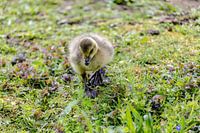 Schon alleine unterwegs ist das Küken der Kanadagans um Futter auf der Wiese zu suchen.