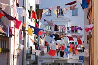 Waslijnen versierd met kleding in de Kirchgasse, Oude Stad, Augsburg, Zwaben, Beieren, Duitsland, Europa