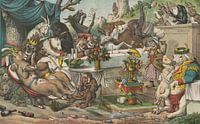 grappige chromolithograph met dieren die eten, drinken, zingen, muziek maken, praten en liefhebben. Bij elkaar gaat het om leeuwen, paarden, een ezel, wolven, schapen, een stier (rund), een aap, een olifant en honden.