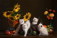 Augustus. Een levend stilleven met jonge katten / kittens zittend in een perronmandje, de bloemen en vruchten van augustus. In alle details heb ik de zomer, de maand Augustus willen laten terugkomen.