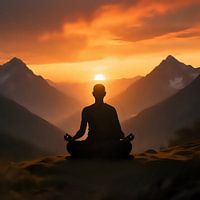 De foto toont een indrukwekkend silhouet van een meditatieman die majestueus op een hoge berg zit. Het tafereel straalt een diep gevoel van rust en spiritualiteit uit, terwijl de zonsondergang de lucht kleurt in zachte oranje tinten die harmonieus samengaan met de blauwe en violette nuances van de avondlucht. Het silhouet van de…