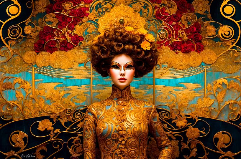 Het kunstwerk: Mysterieus en theatraal. Een vrouw met een filigraan gouden masker staat voor een achtergrond van rode rozen en gouden bogen. De symmetrie van de afbeelding en de intense kleuren doen denken aan een decor of een Venetiaans gemaskerd bal in de stijl van de jaren 1920.