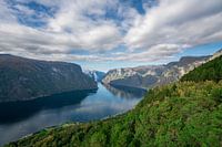Fjorden van Aurland op een zonnige herfstdag in zuidelijk Noorwegen. Half bewolkt en met reflecties in het water