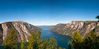 Uitzicht vanaf de hoge kliffen over de Aurlandsfjord in Noorwegen tijdens een mooie zomerdag. De Aurlandsfjord is een aftakking van de hoofd-Sognefjorden, de langste fjord van Noorwegen en samen met de aangesloten Naeroyfjord een van de populairste toeristische attracties in Noorwegen.