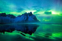 De foto wordt gedomineerd door intens groen oplichtende Aurora Borealis, die de nachtelijke hemel omtovert tot een magisch schouwspel. Op de achtergrond rijst de majestueuze Vestrahorn op, een markant bergmassief dat de scène verrijkt met zijn indrukwekkende silhouet. Deze donkere contouren vormen een fascinerend contrast met het levendige poollicht dat de nachtelijke hemel verlicht. Het noorderlicht wordt weerspiegeld in het aangespoelde lavastrand van de Noord-Atlantische Oceaan en de weerspiegelingen roepen een tweede, betoverend beeld op van dit fascinerende fenomeen. De koude winternacht versterkt de eenzaamheid en rust van deze plek waar de natuur in haar puurste vorm kan worden ervaren.