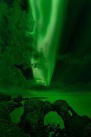 Heldere aurora borealis en sterrenhemel boven een rotspoort op de klif, enkele wolken verlevendigen bovendien het tafereel - Ligging: IJsland, Snaefellsnes (Snæfellsnes), Anarstapi