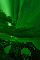 Heldere aurora borealis en sterrenhemel boven een rotspoort op de klif, enkele wolken verlevendigen bovendien het tafereel - Ligging: IJsland, Snaefellsnes (Snæfellsnes), Anarstapi