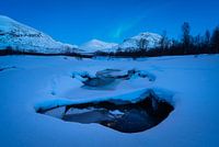 Het eerste Noorderlicht (Aurora borealis) dat al vroeg in de avond zichtbaar is boven de besneeuwde bergen van Zweeds Lapland. Gezien vanaf een riviertje in de bossen van Nationaal Park Abisko. Dit unieke natuurgebied is gelegen aan het gelijknamige dorpje Abisko, een toeristisch trekpleister dat ver boven de Poolcirkel ligt, en zowel zomer's als 's winters het startpunt is voor prachtige avonturen op de Zweedse toendra.