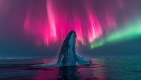 Aurora en een walvis panorama schilderij brengt de magie van de natuur samen in één adembenemend beeld. Onder een hemel die schittert in roze en groene tinten van het noorderlicht, stijgt een majestueuze walvis op uit het water. De beweging van het dier en het dansende licht van de aurora vormen samen een dromerig en betoverend tafereel…