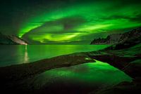 Aurora over de rotsachtige kust van Tugeneset met op de achtergrond het Okshornan-gebergte, Senja, Noorwegen.