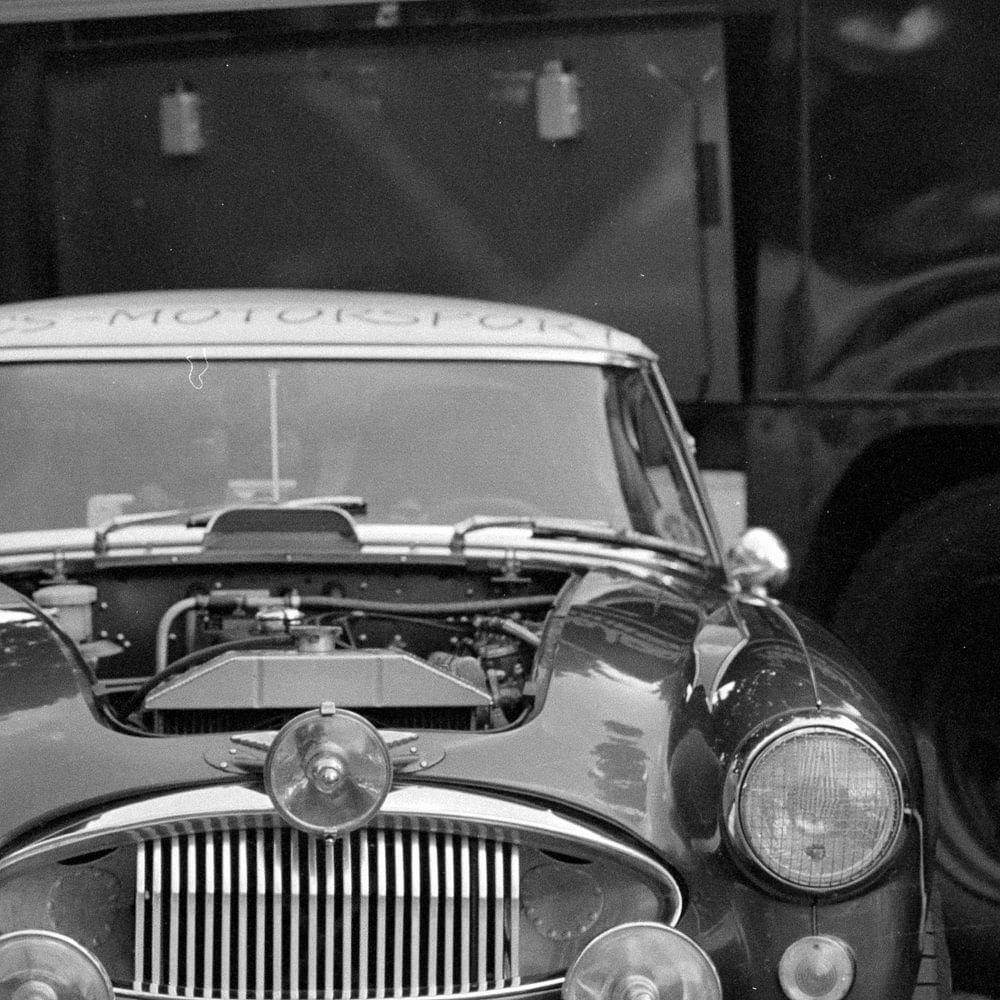 Analoge zwart-wit opname van een oude Austin Healey in prachtige staat.
