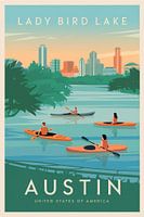 Kleurrijke kajakkers glijden zachtjes over het glinsterende water van Lady Bird Lake, omlijst door een schilderachtig stadslandschap. De harmonieuze combinatie van natuur en stadsleven straalt rust en avontuur uit. Dit kunstwerk brengt een frisse wind in de woonkamer en nodigt je uit om te dromen van zomerse middagen aan het water.