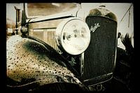 De foto geeft een detail beeld van een oldtimer Austin. De sepia kleur accentueert de vloeiende lijnen van het spatbord en doet de extravagante koplamp goed uitkomen. Het retro beeld past in een modern interieur.