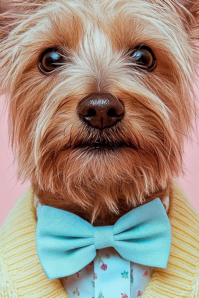 Met zijn puntige oren en charmante gezicht tovert deze Australische terriër een glimlach op ieders gezicht. Hij draagt een modieus geel vest en een elegant strikje en straalt zelfvertrouwen en stijl uit. Zijn levendige uitstraling en glanzende, warrige haar maken hem de perfecte metgezel voor elk elegant evenement.