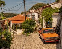 Authentiek Grieks dorpje met oude oranje Datsun Pickup