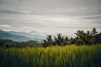 Deze foto toont een betoverend tropisch landschap in Bali, Indonesië, met majestueuze palmbomen en uitgestrekte rijstvelden. Het beeld belichaamt de lokale natuurlijke schoonheid van Bali en vangt de essentie van het lokale leven. De weelderige groene palmbomen contrasteren prachtig met de gouden rijstvelden, waardoor een adembenemend uitzicht ontstaat. Dit is een eerbetoon aan de symbiotische relatie tussen de lokale bevolking en hun natuurlijke omgeving.