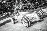 Auto Union Grand Prix Rennwagen Type C V16 rijdt op hoge snelheid. Panning foto in zwart-wit.