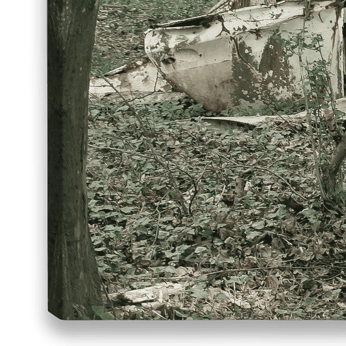 Een auto,een wrak,half vergaan door de tijd. In een verlaten bos.Lotharingen (fr).Vergane schoonheid.