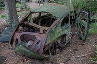 Autokerkhof in een bos in Ryd in Zweden. Verspreid over bos liggen autos uit de 40-er en 50-er jaren als oud schroot te vergaan.