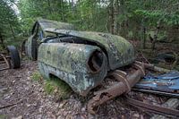Autokerkhof in een bos in Ryd in Zweden. Verspreid over bos liggen autos uit de 40-er e50-er en 60-er jaren als oud schroot te vergaan.