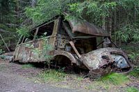 Autokerkhof in een bos in Ryd in Zweden. Verspreid over bos liggen autos uit de 40-er e50-er en 60-er jaren als oud schroot te vergaan.