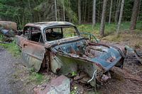 Autokerkhof in een bos in Ryd in Zweden. Verspreid over bos liggen autos uit de 40-er e50-er en 60-er jaren als oud schroot te vergaan.