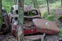 Autokerkhof in een bos in Ryd in Zweden. Verspreid over bos liggen autos uit de 40-er e50-er en 60-er jaren als oud schroot te vergaan.