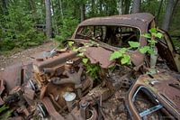 Koop de foto Auto kerkhof in bos in Ryd, Zweden van Joost Adriaanse op canvas, aluminium dibond, (ingelijste) fotoprint, behang en ArtFrame, op maat geprint in Fine-Art kwaliteit.
