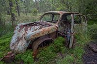 Autokerkhof in een bos in Ryd in Zweden. Verspreid over bos liggen autos uit de 40-er e50-er en 60-er jaren als oud schroot te vergaan.