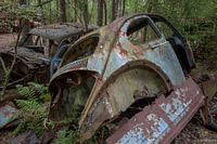 Koop de foto Auto kerkhof in bos in Ryd, Zweden van Joost Adriaanse als print op canvas, aluminium dibond, (ingelijste) fotoprint, behang en ArtFrame. Voor jou op maat geprint in Fine-Art kwaliteit.
