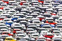 Je ziet rijen van auto met verschillende kleuren. De auto's wachten in een havengebied om te worden verscheept.