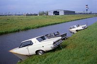 (C)Roel Dijkstra-Vlaardingen - Foto Collectie Bart HofmeesterNG. Auto's (o.a Dodge en NSU) in het water bij luchthaven Rotterdam (Zestienhoven), in 1960