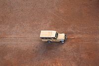Vanuit een hete luchtballon is een auto gefotografeerd op het rode zand landschap van de woestijn in Namibië, Afrika.