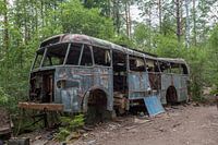 Autokerkhof in een bos in Ryd in Zweden. Verspreid over bos liggen autos uit de 40-er e50-er en 60-er jaren als oud schroot te vergaan. Autobus (bus) in het bos.
