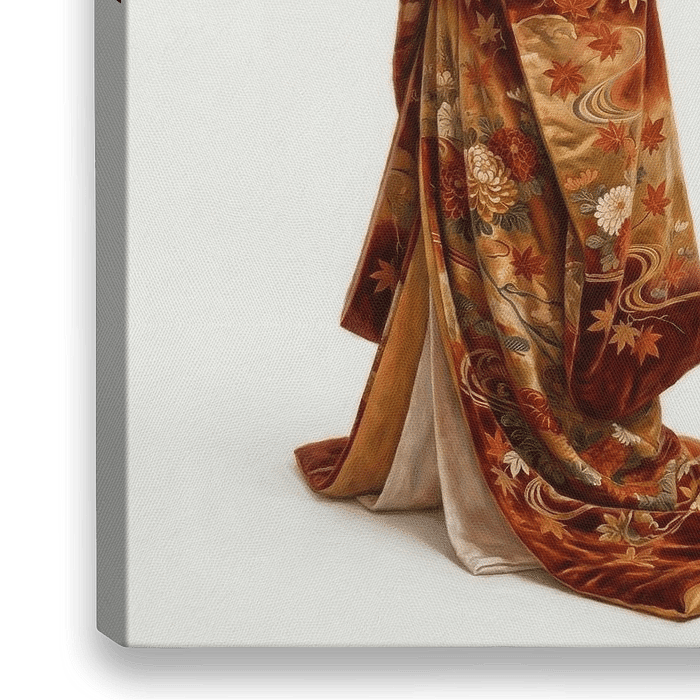 "Autumn Geisha" toont een geisha in een verfijnde, traditionele kimono, rijk gedecoreerd met herfstkleuren en motieven zoals esdoornbladeren en chrysanten. De warme, diepe kleuren van rood, goud en bruin vangen perfect de essentie van het…
