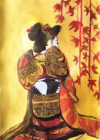 Modern portret van een Japanse vrouw in Kimono, in de stijl van de traditionele Geisha's. Het origineel is gemaakt met ecoline en Oost-Indische inkt waar stukjes bedrukt papier aan zijn toegevoegd.