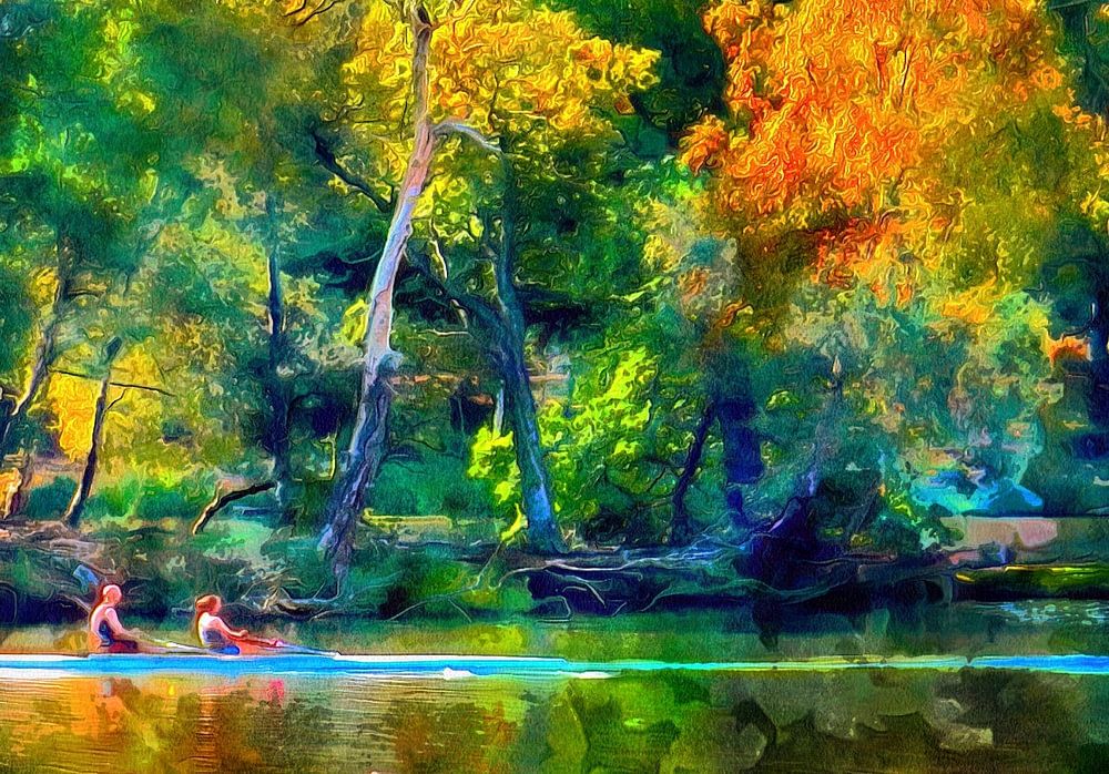 Dit is een typisch Engels tafereel van een twee roeispaan op een rustige rivier, verlicht door de zon die het begin van de herfstkleuren benadrukt. Het tafereel suggereert vrede en rust op een rustige dag met weinig wind en alleen het geluid van de vogels op de oever. Fotokunst.