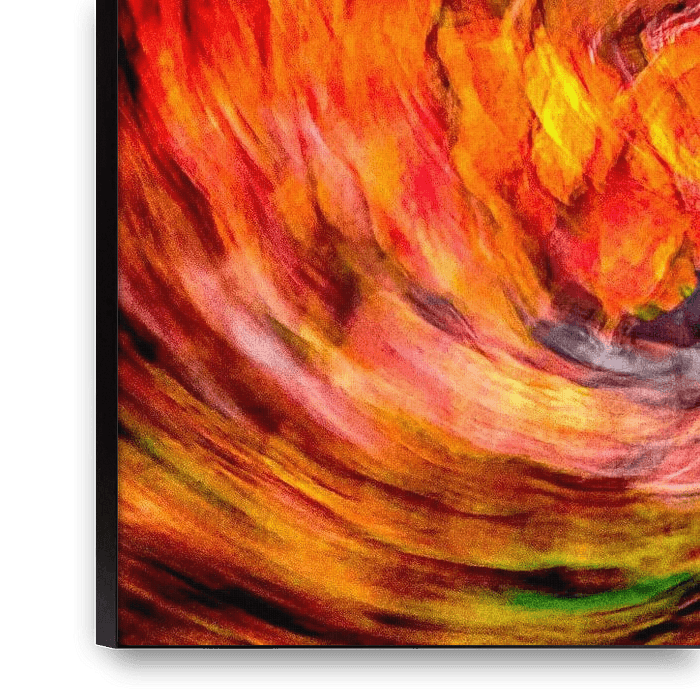 Herfstblad van onderen gefotografeerd en de camera bewust gedraaid met verschillend sluiterijden. Door het draaipunt op een gulden snede te plaatsen en de kleuren wat knallend te maken een plaat waar je even kunt bij wegdromen.