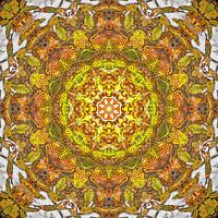 Een caleidoscopisch beeld dat de schoonheid van de herfst viert, gebaseerd op een foto van zonovergoten gele en bruine beukenbladeren