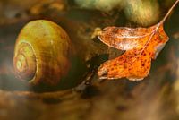 Met dubbele belichting een herfstsfeer gecreëerd waarin de slak een prominente rol speelt naast het herfstblad.