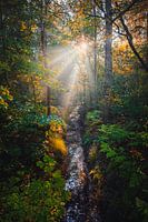Het herfstbos op Texel. De zonnestralen in de mist, het slootje, de mooie tinten. Dit is een schitterende plaat voor aan de muur.
