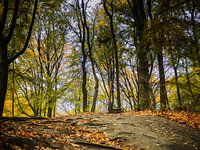 Herfst in het bos. Blaadjes zijn al gevallen en liggen op de grond en het pad, de bomen hebben nog wat kleur maar deze zal langzamerhand verdwijnen. Dit pad is te vinden in de bossen rond de Duivelsberg, een populair wandegebied in Berg en Dal, bij Nijmegen. De Duivelsberg (Duits: Wylerberg of Teufelsberg) is een heuvel en natuurreservaat in de gemeente Berg en Dal in de Nederlandse provincie Gelderland, aan de grens met Duitsland. De 75,9 meter hoge heuvel is gelegen op de stuwwal ten oosten van Nijmegen, tussen Berg en Dal, Beek en de Nederlands-Duitse grens. Het natuurgebied De Duivelsberg beslaat ongeveer 125 hectare en is voornamelijk begroeid met loofbomen, vooral met de tamme kastanje. Het wordt beheerd door Staatsbosbeheer.