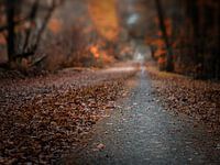 Een weg door een bos in herfstkleuren. Door gebruik te maken van een laag standpunt leid de weg de kijker de foto in. Deze foto is gemaakt met een lensbaby, creatieve lens waardoor de scherptediepte heel beperkt is en de foto een dromerige sfeer krijgt.