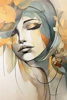 Abstract schilderij van een vrouw in gedachten, herfstkleuren en bladeren.