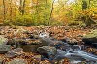 Herfst in de Belgische Ardennen nabij Jalhay (Wallonië, België). Rivier De Hoëgne stroomde, zij het met minder water dan normaal door de droge zomer, door een schitterend gebied. De herfstkleuren maakten het gebied sprookjesachtig. Heerlijke locatie voor landschapsfotografie.