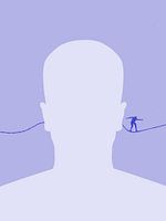 Een plaatshouder-avatar van het internet, door wiens oren een slackline loopt, waarop een balancerend persoon met uitgestrekte armen voorzichtig naar voren beweegt. De silhouetachtige avatar neemt dit onbewogen ter kennis. De surrealistische afbeelding is uitgevoerd in koele lila- en violette tinten en oogt uitgesproken…