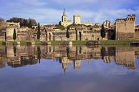 Het historische centrum van Avignon wordt weerspiegeld in het water van de overstroomde Rhône.