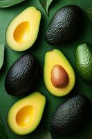 Dit kunstwerk toont een aantrekkelijke compositie van avocado's tegen een groene achtergrond. Het contrast tussen de donkere schil en het romige vruchtvlees wordt benadrukt, terwijl de gedetailleerde texturen de zintuigen prikkelen. De symmetrische rangschikking en het spel van licht en schaduw creëren een harmonieus beeld dat zowel esthetisch als appetijt opwekkend is. Dit stilleven verheft de avocado tot een onderwerp van artistieke contemplatie, waarbij het de natuurlijke schoonheid en voedzaamheid van de vrucht viert.